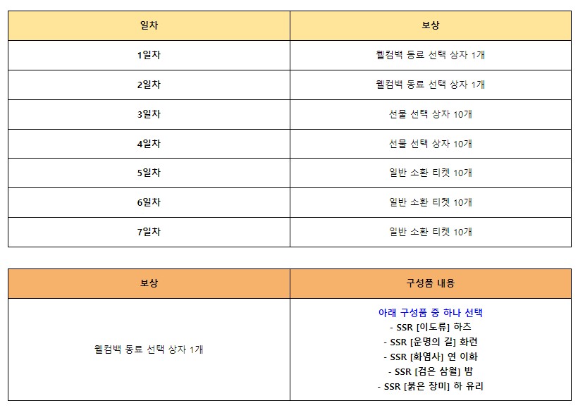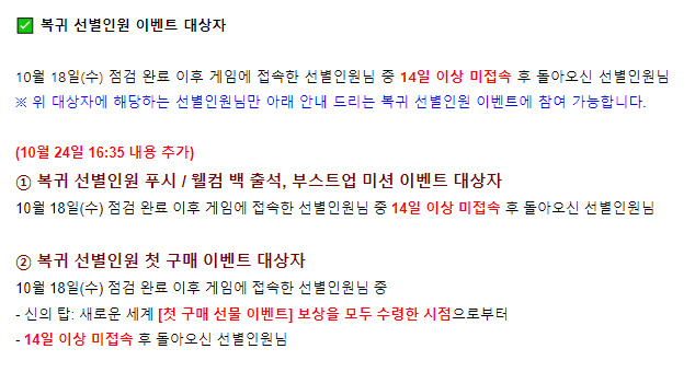 꾸쀼쀼 신의탑 새로운 세계 복귀 유저 이벤트도 있음요 작성일시 : 2023. 10. 24 (17:43) 조회 : 581 / 댓글 : 1 신의탑 새로운 세계 지금 복귀 유저 이벤트 하는데14일 이상 미접속 유저가 복귀 유저에 해당 돼요출석부에 부스트업 미션 이벤트도 하고복귀는 선별인원 푸시 이벤트도 따로 해요웰컴백 동료 선택 상자로 하츠도 받을 수 있어서 좋긴 함..ㅋㅋ 저는 복귀 유저는 아니고... 그냥 기존 유저여서 ㅋㅋㅋㅋ복귀 푸시나 출석 보상은 못 받지만누적 출석부도 계속 진행 중이거든요한달치 다 채워서 오늘 새로 누적 출석부로 다시 시작했어요 ㅋㅋㅋ 1추천 글쓰기스크랩 신고