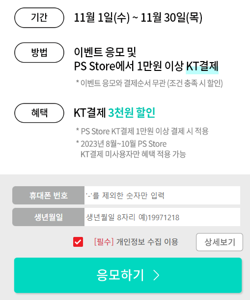 도붸르만 KT가 진짜 콘솔게임까지 할인해주다니! 작성일시 : 2023. 11. 06 (02:21) 조회 : 277 / 댓글 : 0 KT를 사용하면서 이 할인해주는거 뺴먹을 수가 없는데 우선 번에 KT에서플스 스토어에서 1만원만 초과 결제해도3천원 할인 해주는 이벤트 하고 있 어서바로 해놨습니다. ㅎㅎ안그래도 요즘 콘솔게임 하고 싶은거 있었는데할인도 받고 완전 좋네요 1추천 글쓰기스크랩 신고