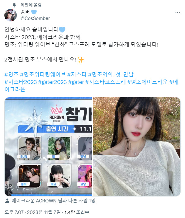 꾸쀼쀼 지스타2023 명조 부스에 코스어 오던데 작성일시 : 2023. 11. 13 (14:35) 조회 : 458 / 댓글 : 1 지스타2023 명조 부스에 코스어 오던데 솜버님 트위터에서 보니까 명조 부스 참가한다고 하더라고요 ㅋㅋㅋㅋ심지어 그냥 오는 거 아니고 모델로 오는 거여서과연 어떤 코스프레 할지 좀 기대하는 중....원래도 가려는 지스타였지만 솜버님이 명조 부스에 코스프레 하러 오는 거면.. 무조건이죠 ㅋㅋ 2추천 글쓰기스크랩 신고