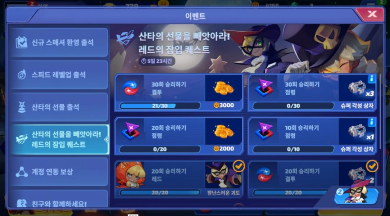 치토스 스매시 레전드 산타의 선물을 빼앗아라 이벤트로 작성일시 : 2023. 12. 13 (16:59) 조회 : 350 / 댓글 : 1 레드의 잠입 퀘스트가 열렸는데제 주캐 중 하나가 또 레드였어가지고 손쉽게 달성했습니다 ㅋㅋ아마 저번주가 엘리스였으니까 또 다음주되면 캐릭 바뀌면서 보상도 바뀔 거 같은.. 그나저나 보상으로 받은 스킨 넘 맘에듭니다무슨 괴도 느낌도 나고 ㅋㅋㅋ 1추천 글쓰기스크랩 신고