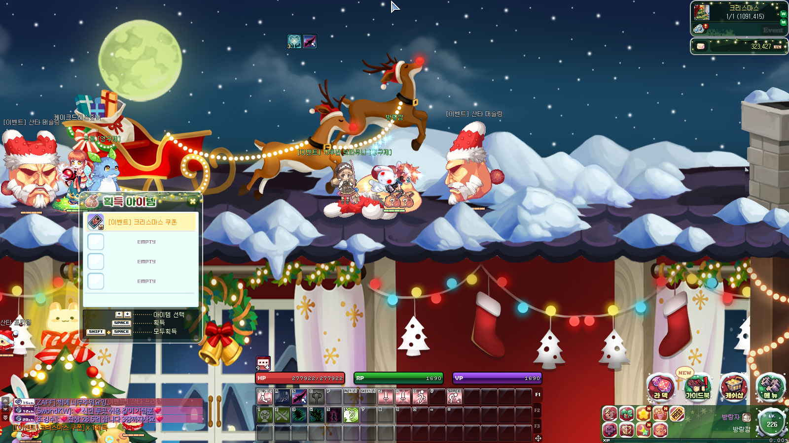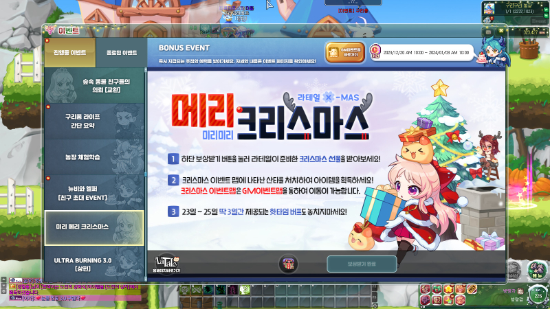 아흑 라테일에도 크리스마스 이벤트 한창이군요~ 작성일시 : 2023. 12. 26 (17:26) 조회 : 366 / 댓글 : 1 라테일 오랜만에 버닝 3.0도 있고해서 복귀했는데오...크리스마스 이벤트에 농장 이벤트도 있고뭔가 많아가지고 이벤트 맵에서 보상 챙기는 재미가 있습니다일단 구리구리 농장 체험 티켓 받고 농장 숙제도 하고 크리스마스 이벤트 맵에서는 산타를 잡고 나오는크리스마스 쿠폰으로 아이템 교환도 할 수 있어가지고이번에 복귀하면 좋을거 같습니다. ㅎㅎ라테일 다시해도 재밌네요 ㅋㅋ 1추천 글쓰기스크랩 신고