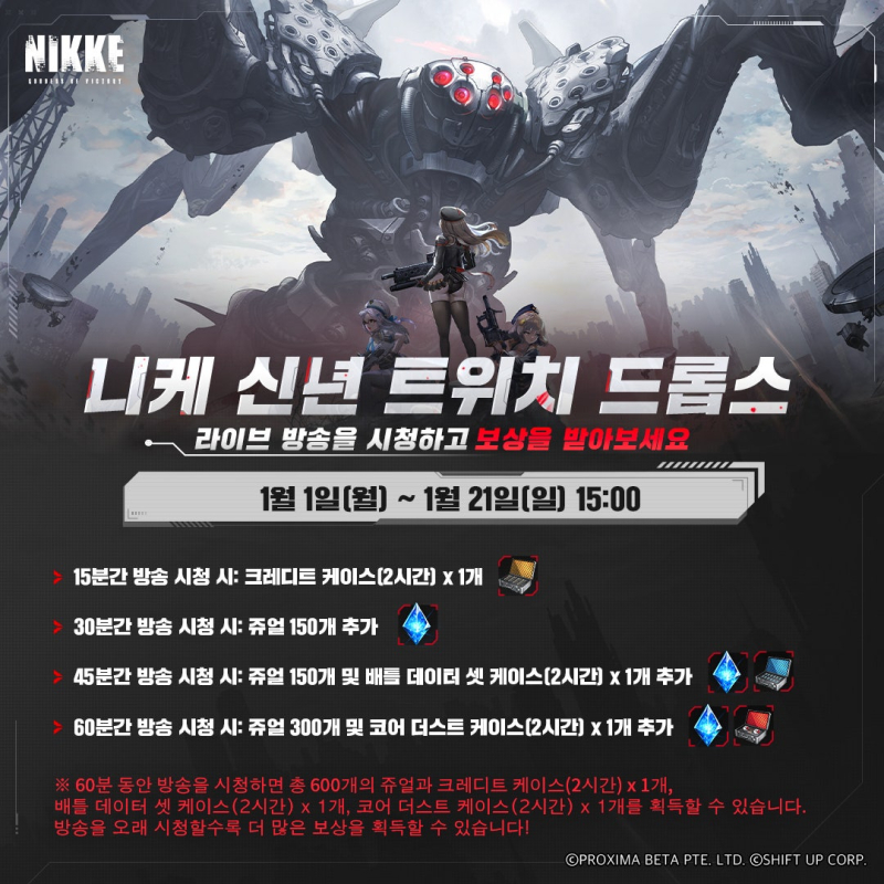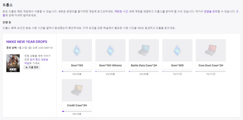 꾸쀼쀼 니케 트위치 드롭스 하는 중 작성일시 : 2024. 01. 09 (13:35) 조회 : 566 / 댓글 : 1 니케 지금 트위치 드롭스 이벤트 하고 있더라고요트위치 계정 니케 홈페이지에서 연동 하면 되고방송 시청만 잘해도 이거 인게임 보상 받을 수 있어요 트위치에 들어가면 드롭스 및 보상 카테고리 있거든요여기서 보상 확인 가능해요저도 트위치 드롭스 이벤트 참여하기 시작했으니보상 다 받아둘 생각 ㅋㅋㅋ 2추천 글쓰기스크랩 신고