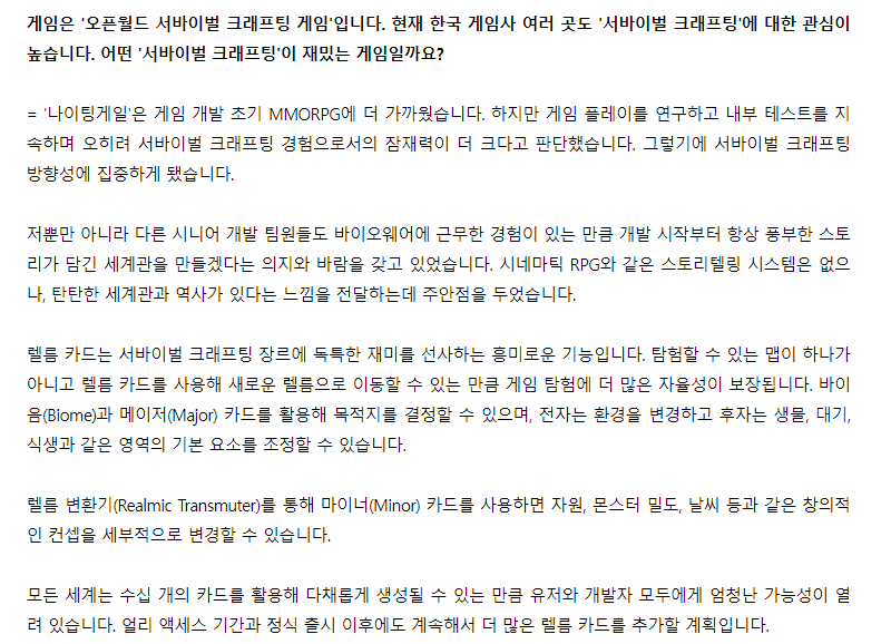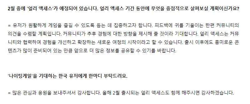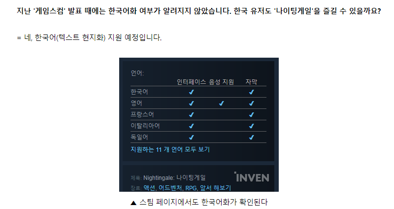 n215165884 나이팅게일 인터뷰 떳어요 작성일시 : 2024. 02. 06 (18:26) 조회 : 404 / 댓글 : 0 오픈 얼마 안 남아서 기다리고 있던 게임인데인벤 들어가보니까 인터뷰 떠 있길래 돚거해왔습니다 ㅎ 보니까 저번 게임스컴에서 공개 안했던 한국어화 관련 내용도 그렇고 초기 개발 과정 및 핵심 요소 중 하나인 렐름에 관한 정보까지저처럼 겜 기다리는 분들 궁금해 할 이야기 좀 많아서 즐거웠던 ㅎ 공식적으로 감사 인사까지 전해줬으니까겜 나오면 열심히 달려야죠 1추천 글쓰기스크랩 신고