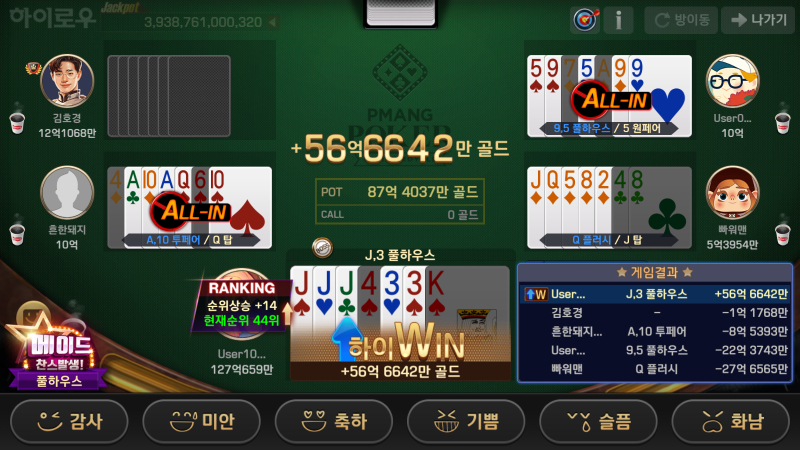 MIRATK 첫 턴에 바로 풀하우스가 뜬다? 작성일시 : 2024. 02. 15 (14:51) 조회 : 396 / 댓글 : 0 피망포커하는데 패 추가돼서가 아니라 첫 턴에 바로 풀하우스가 뜨네요와중에 풀하우스 뜬 사람 한 명 더 있었는데 1등으로 이기다니 진짜 대박인 듯ㅋㅋㅋㅋ피망포커 할 때마다 마지막 패에서 풀하우스 족보가 뜰 때도 기분이 엄청나지만처음부터 거의 무패를 갖고 이어가는 것도 정말 즐거운 거 같아요~~ 1추천 글쓰기스크랩 신고
