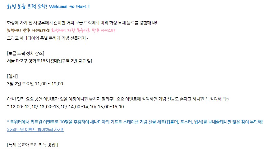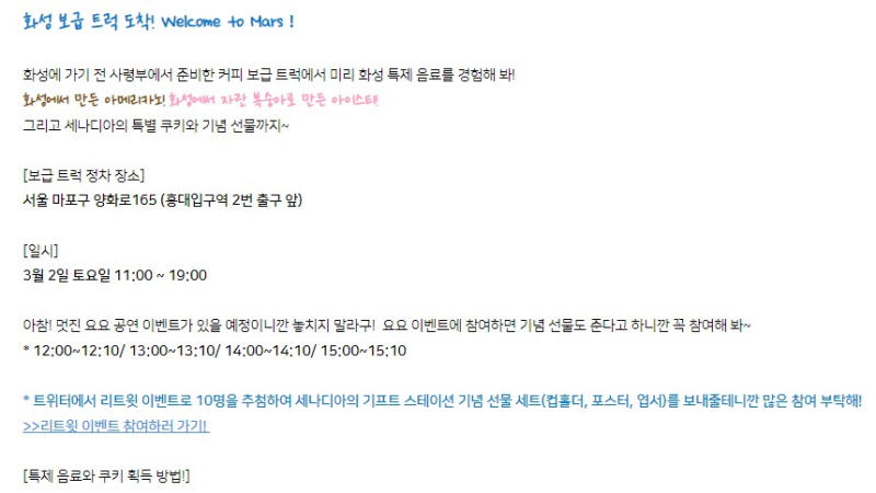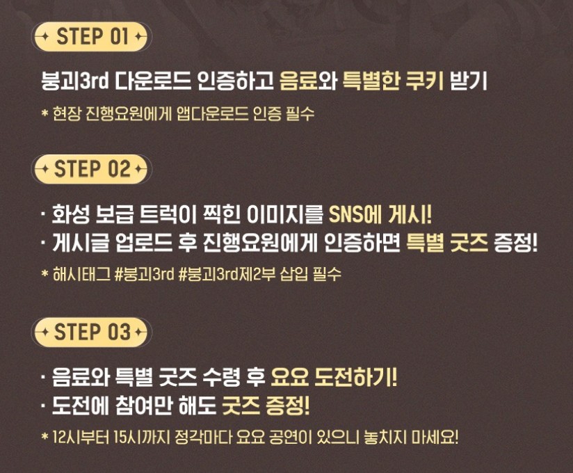 사이라 붕괴3 2부나온다고 작성일시 : 2024. 02. 28 (17:10) 조회 : 823 / 댓글 : 1 이번에 화성 보급 트럭을 홍대입구 2번출구에 세운대요이거이벤트도 있는데 가서 붕괴3설치된거 인증하면 특별 굿즈도 증정될 예정이거든요 설치된거 그냥 인증만해도 특별 음료도 주고 SNS게시하면 특별 굿즈도 준대요그리고 요요 도전도 할 수 있는데 도전만해도 또 굿즈라니까굿즈는 진짜 많이 받아갈 수 있을듯 관심있으시면 3월 2일에 홍대 한 번 가보세요 2추천 글쓰기스크랩 신고