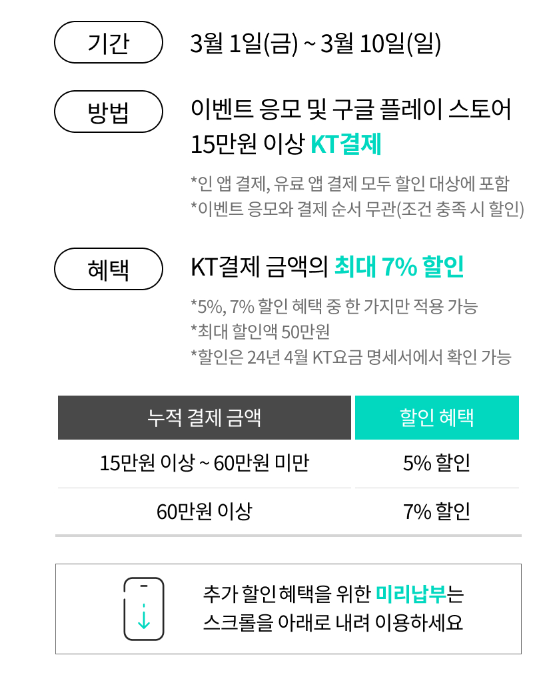 도붸르만 이번 KT 구글 플레이 할인은 7프로나 할인 ㄷㄷ 작성일시 : 2024. 02. 29 (00:33) 조회 : 1,128 / 댓글 : 0 이번 KT의 구글 플레이 할인 이벤트는무려 15만원 이상 결제시 최대 7프로나 할인 해주는데최대 할인액이 50만원이나 되가지고 대박입니다.60만원 이상 결제시 7프로 할인인데와..몇만원씩이나 할인 해주는거면 이거패키지 한 두개 더 사도 될 정도로 해주네요 2추천 글쓰기스크랩 신고