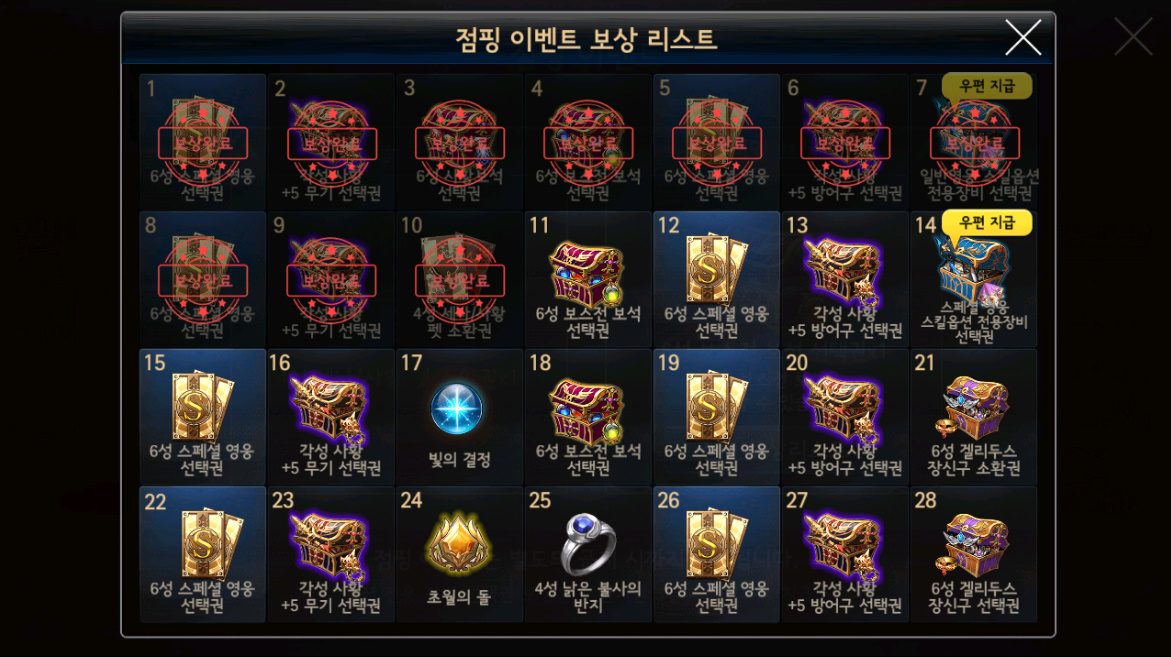 각종 장비, 뽑기권, 각성석을 주기때문에 처음하는 신규유저들에게도 굉장히 혜자인 이벤트라고 생각이 되네요.