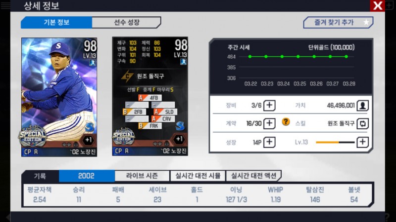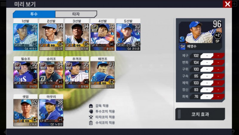 저는 노장진 선수가 나왔는데 마무리 투수로 나왔네요..