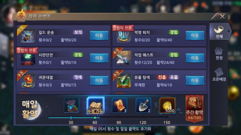 직업퀘스트는 '참여' 아이콘 눌러서 확인할 수 있어영!