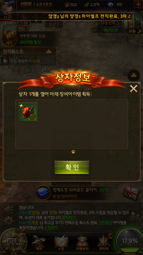 빨강카트붕붕 편리하고 쾌적하게 플레이 할 수 있어서 좋습니다. 작성일시 : 2018. 11. 08 (12:41) 조회 : 1,724 / 댓글 : 0 오늘 점심시간에 뮤온라인H5 접속했더니 역시 하루만 지나면경험치랑 엄청나게 많은 아이템들이 많이 들어오는군요.직접 던전을 돌지 않아도 스스로 장비상자를 얻을 수 있으니직장인들한테는 최고의 게임인거 같습니다.저도 직장인이지만 이렇게 편리한 게임을 해 본건 처음인거 같습니다. 그리고 Html5 기반이라서 그런지 렉없이 게임이 진행되서 좋습니다.또한 뮤온라인IP를 들고 왔다고하니 예전에 뮤 시리즈를 해 보신분들은 추억을 느낄 수 있을 거 같습니다. 2추천 글쓰기스크랩 신고