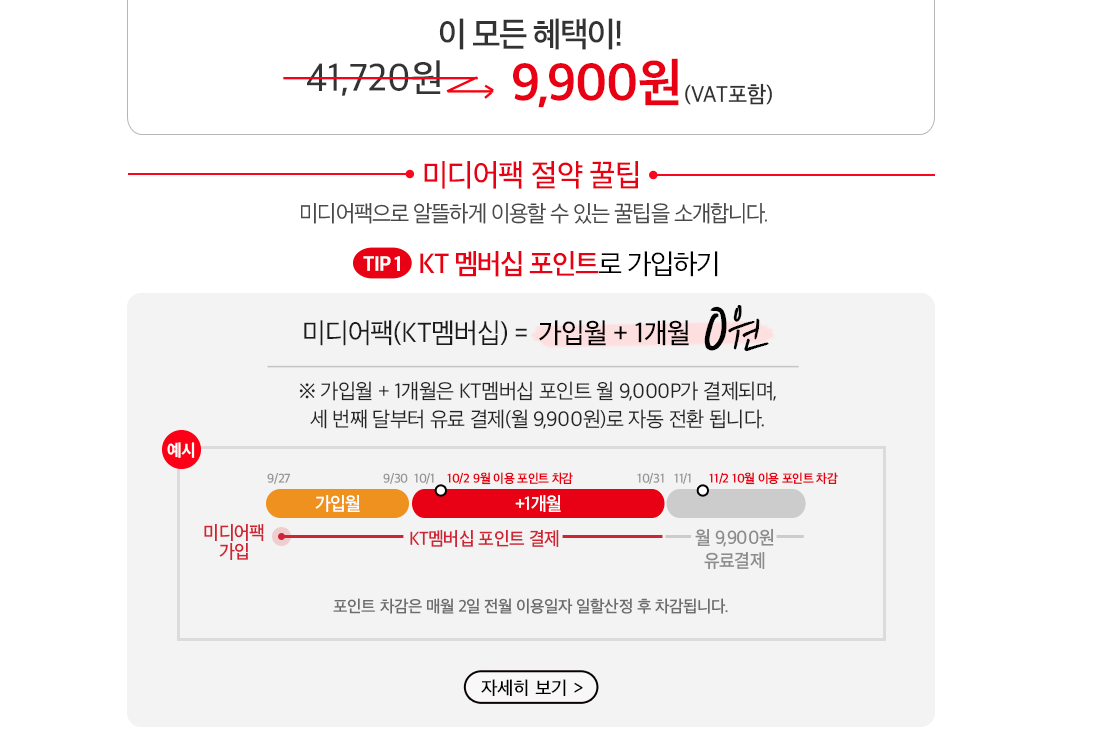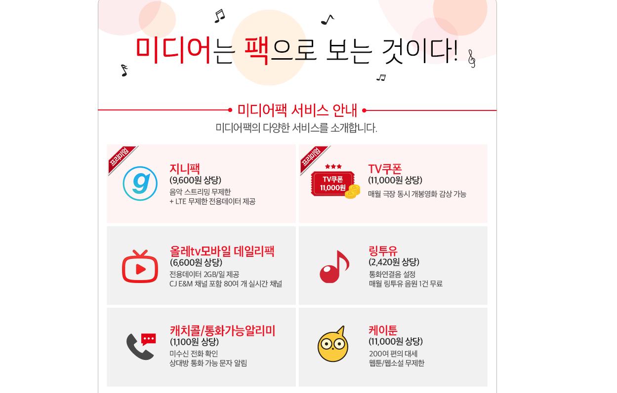 이요호호호 KT 미디어팩 좋아보이네요 작성일시 : 2018. 11. 15 (19:00) 조회 : 2,438 / 댓글 : 0 지니뮤직 TV쿠폰 올레TV 모바일 링투유 캐치콜 케이툰까지 싹다 묶어서 월 9,900원으로 사용할 수 있다고 합니다. 저거 어림해보니까 거의 4만원? 정도 되는 돈인데 그걸 1/4가격에 쓸 수 있다는 것 하나만으로도 좋네요. 지니뮤직은 제가 실제로 쓰는 건데, 그것만 해도 월 9천원 돈입니다 몇백원 더 내고 저거 다 쓸 수 있으니 혜자가 따로 없는 듯... 저걸로 바꿔야겠네요 2추천 글쓰기스크랩 신고