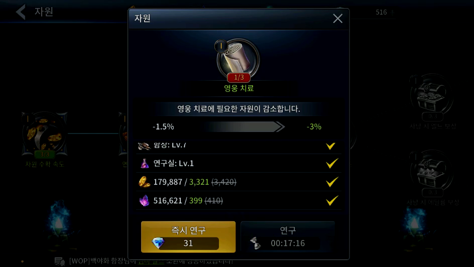 연구 가속 아이템은 나중에 연구 속도가 느려질 때 쓰는 게 더 낫습니다. 특히 1시간 넘게 연구하는 것들일수록...