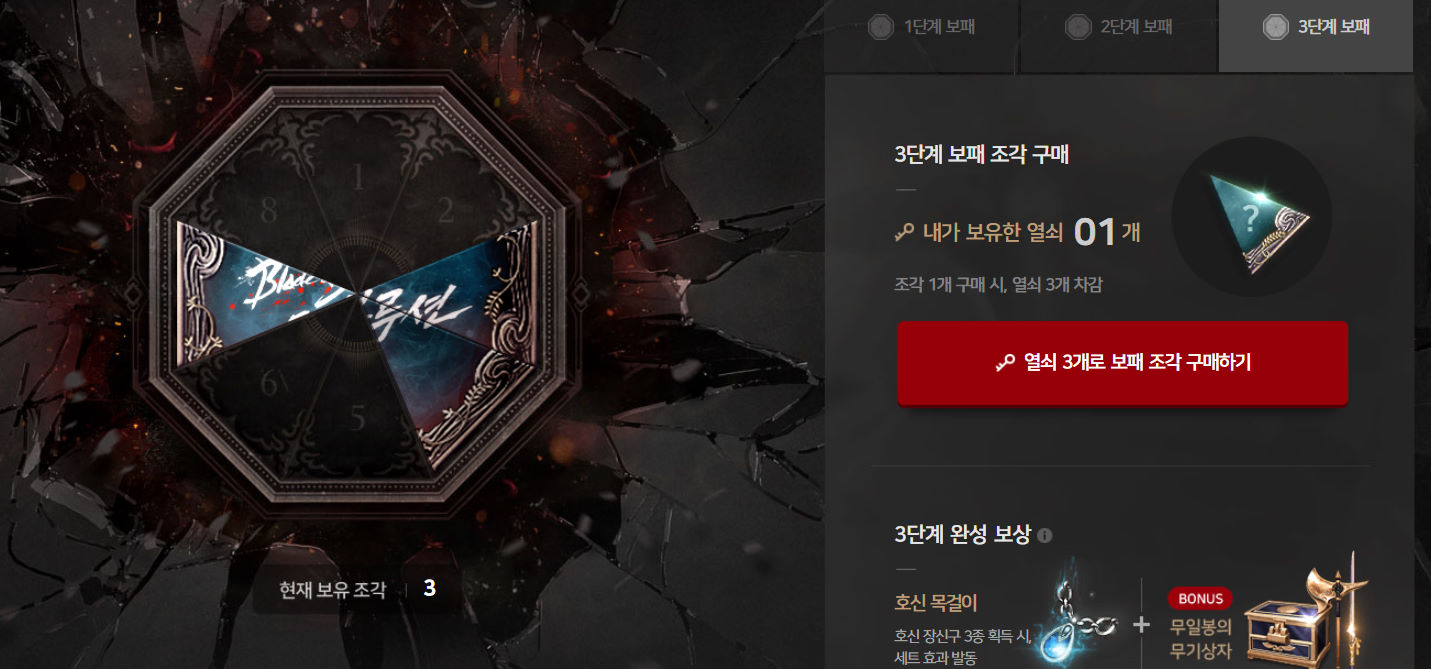 지금은 3단계 모으는중! 단계별로 반지, 목걸이, 무기까지 주니 오픈전 미리 준비해놔야지ㅋㅋ