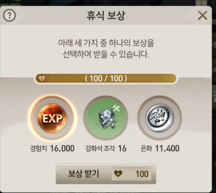 휴식 보상은 백 퍼 채운 다음에 경험치를 택하면 바로 레벨업할 수 있을 정도로 경험치를 많이 주고