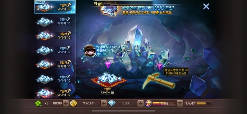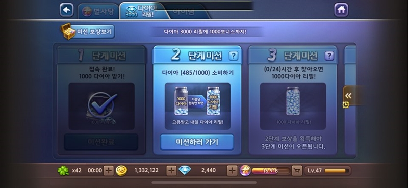 이번 업데이트로 추가된 다이아 리필 미션은 첫 날 1,000다이아를 보상으로 준 다음