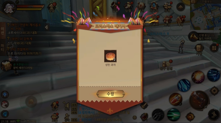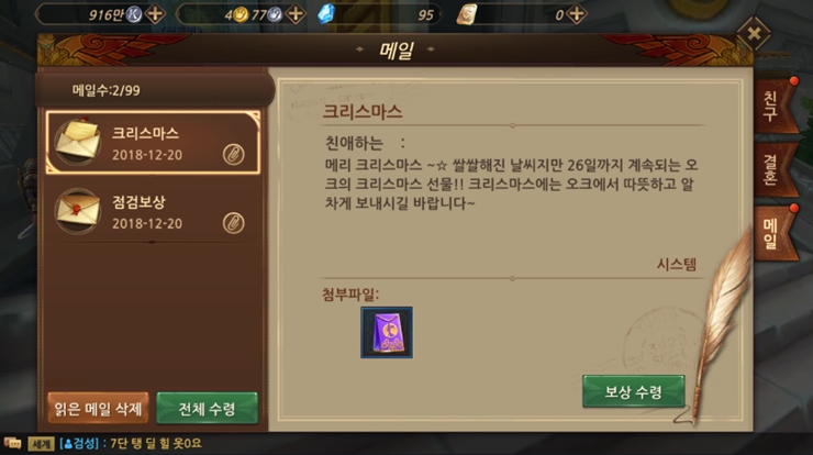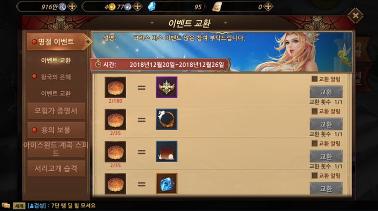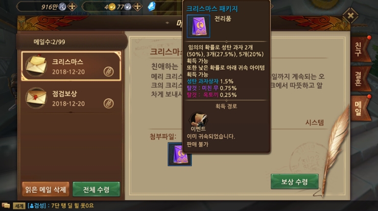 웨저렙 크리스마스라고 선물 받았어욥 작성일시 : 2018. 12. 20 (21:40) 조회 : 1,801 / 댓글 : 1 오크 접속하니깐 크리스마스라면서 패키지 아이템 선물 받았습니당낮은 확률로 탈 것을 주는데 옥토끼 너무 갖고 싶더라구요.. ㅎ_ㅎ 비록 성탄과자가 나왔지만...! 이벤트 교환소에서 성탄과자로 바꿀 수 있는 아이템이 꽤 많더라구요.오늘부터 26일까지 약 일주일동안 진행하니까 과자 모아서 말풍선으로 바꿀거에요~!(성탄 과자는 상점에서 DM으로 살 수 있습니당) 3추천 글쓰기스크랩 신고
