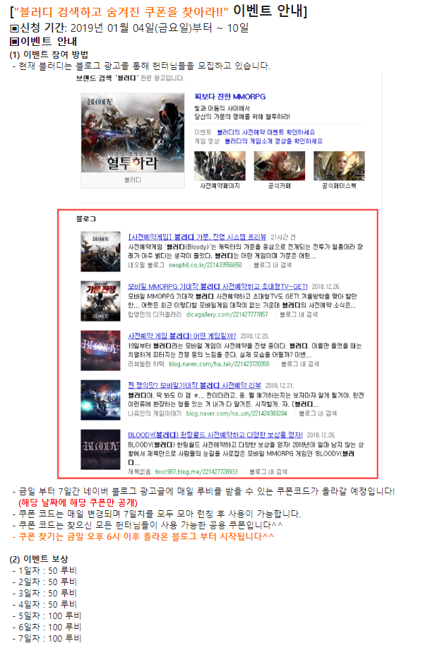 박소미 맨날 블러디 검색해야겠당... 작성일시 : 2019. 01. 05 (22:28) 조회 : 1,846 / 댓글 : 0 블러디 정식 오픈하면 게임 해보려고 하는데공식 카페 가입하니깐 이벤트 진행하고 있는게 많더라구요.이번에 새로 시작한 이벤트는 블로그 글에서 쿠폰 코드 찾기인데정식 오픈 후에 루비 보상 받을 수 있는 이벤트라 꼭 참여해야겠더군요. 이렇게 블러디 검색한 후, 블로그 글 보면서 쿠폰 코드를 찾으면 됩니다.공식 카페같은 곳에 공유하면 안된다고 하니깐 참고하세요!총 500루비 받을 수 있는 이벤트라 저도 열심히 쿠폰 코드 찾아봐야겠습니당ㅎ.ㅎ 2추천 글쓰기스크랩 신고