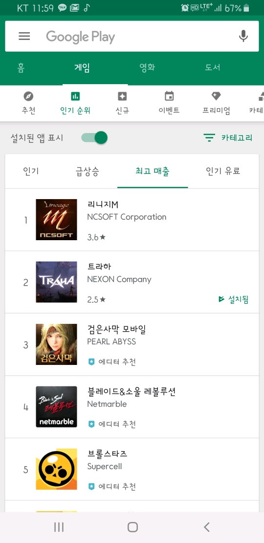 이번에 구글 플레이 최고매출에 트라하 올라갔네요