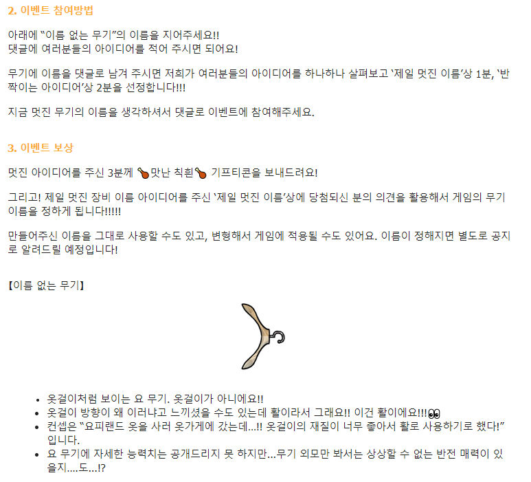 온나다나와 과연 이 무기의 이름은 무엇이 될까!? 작성일시 : 2019. 05. 31 (16:42) 조회 : 1,841 / 댓글 : 0 열렙전사 2차 CBT 참여 했습니다.1차 때랑 다르게 엄청 개선 되었더라구요.스킬 이펙트나 UI들도 엄청 개선되고 완전 만족크~일단 가볍게 즐기기에 최고라 하루 빨리 출시기다리고 있습니다. 공카에서 재미있는 이벤트도 진행 중인데요.분명 제가 보기엔 옷걸인데 이걸 무기라고 하네요?ㅋㅋㅋㅋㅋ이름 없는 무기에 이름을 지어주고 추첨을 통해 3명에게 칙흰을 선물 하고 있습니다. 댓글에 벌써 재미있는 이름들 엄청 많이 올라왔는데 뭐라고 지으면 될까요? 2추천 글쓰기스크랩 신고