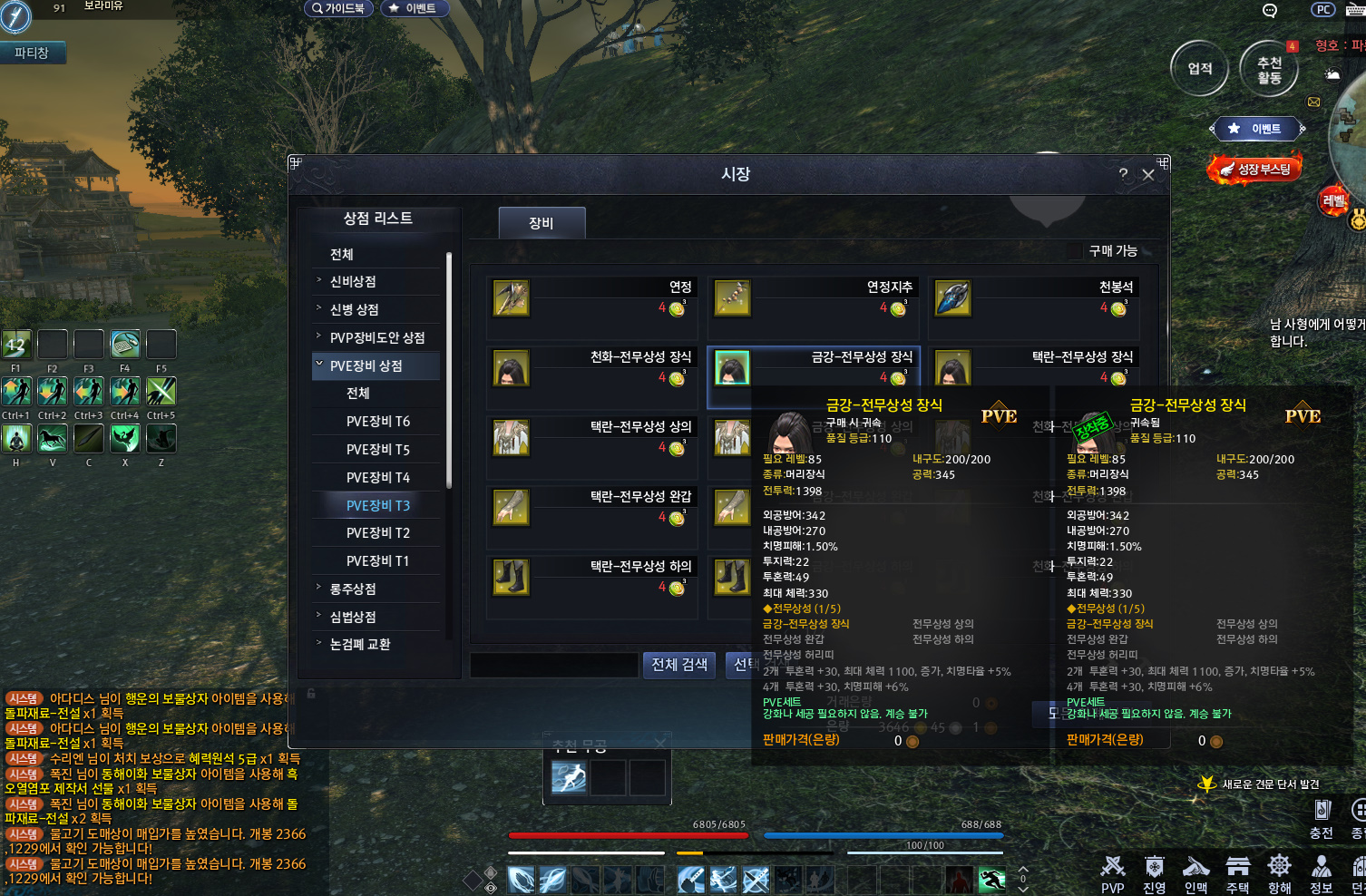 방어구는 금강으로 맞추고 무기와 악새서리는 천화로