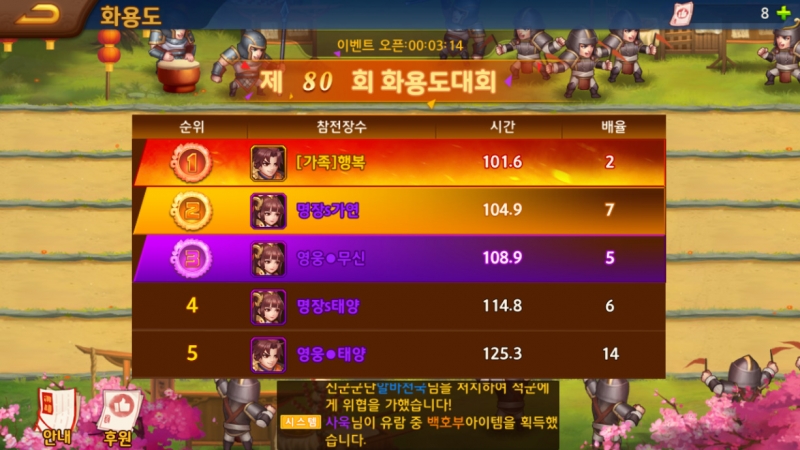 삘릴릴리 확실히 황색장수들로 다 맞추니까 쭉쭉미네요ㅋㅋ 작성일시 : 2019. 09. 30 (09:59) 조회 : 1,864 / 댓글 : 1 쌍삼국지에서 이벤트로 주는 금화 모아서 장수뽑기를 하니까황색 장수를 금방 모을 수 있더라구요ㅋㅋ 그래서 일단 파티는황색 장수로 다 맞췄는데 다음은 조합을 맞춰야 겠네요.협동스킬을 사용하면 더 쎈데 조합이 안 맞음...ㅋㅋ 아침에 출근하자마자 켜서 스테이지 밀고 있는데화용도를 한다고 해서 기다리고 있다가 바로 후원했어요ㅋㅋ전투력 상위 50위 유저중에 랜덤으로 5명이 참전하는데순위가 낮을 수록 배율이 더 쎄더라구요ㅋㅋ 이번엔 과연 누가 1등할지... 2추천 글쓰기스크랩 신고