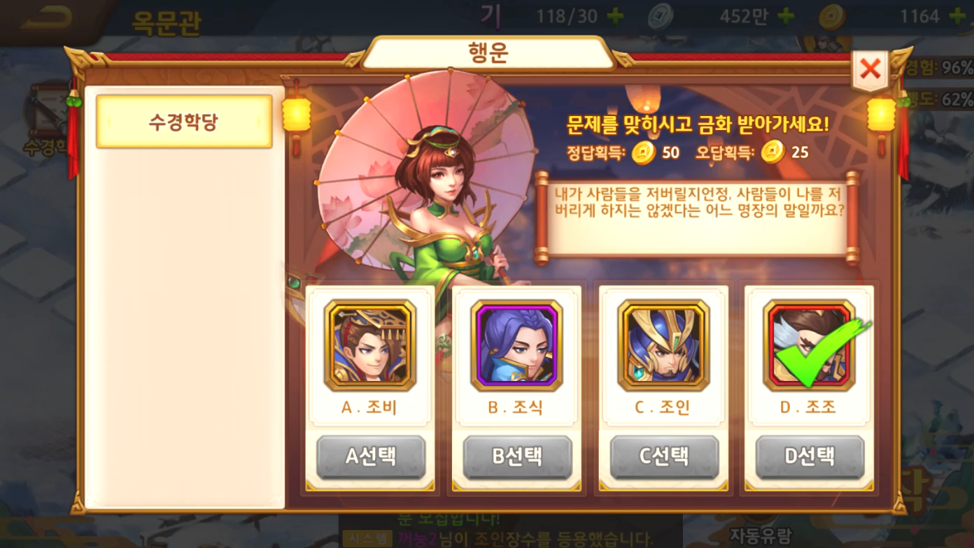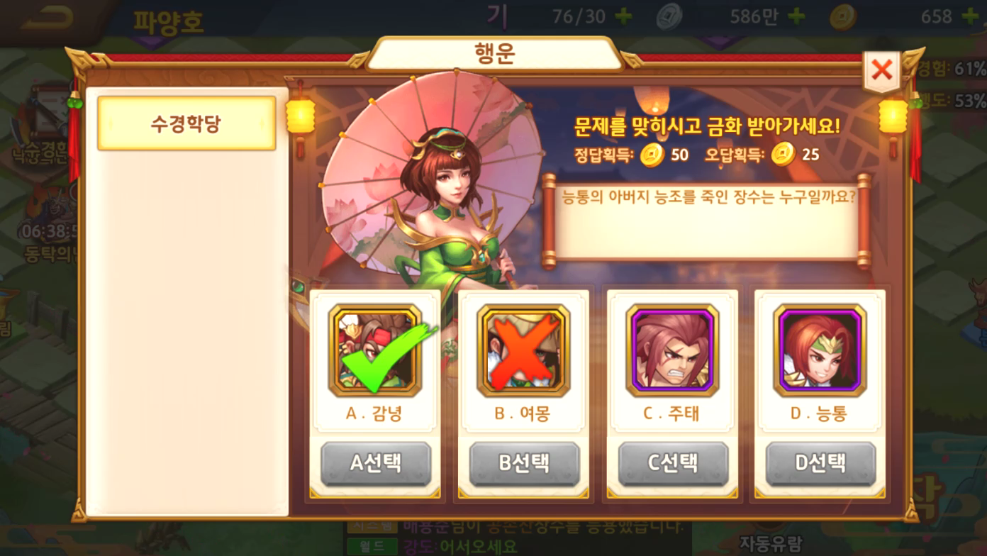 특히 수경학당이라는 삼국지 관련 문제를 푸는 미니게임은 맞추어도 금화를