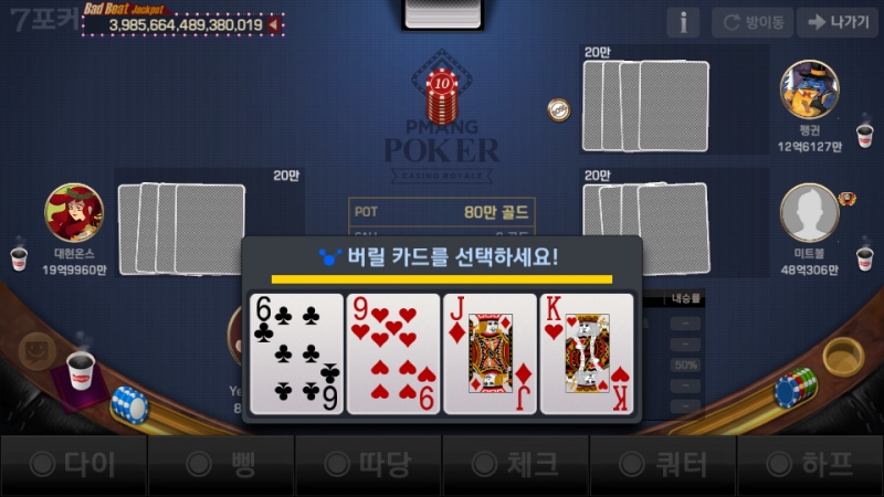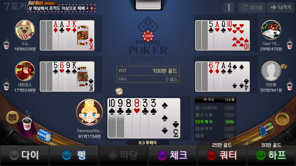 베래스 오늘은 포커 한판~ 작성일시 : 2019. 10. 07 (14:30) 조회 : 1,722 / 댓글 : 1 요즘 앱스토어에서 윈조이포커 받아서 간간히 하는데하다 보면 시간가는 줄 모르고 하는 거 같네요 ㅋㅋㅋ 개인적으로 포커 막 좋아하는 편이 아닌데이건 하다 보니깐 재밌네요,, ㅋㅋㅋㅋㅋ 아 처음에 버릴 카드 고를 때 너무 고민 됩니다 진심;어떤 카드 버리는가에 따라서 또 다르니깐 ㅋㅋ 2추천 글쓰기스크랩 신고