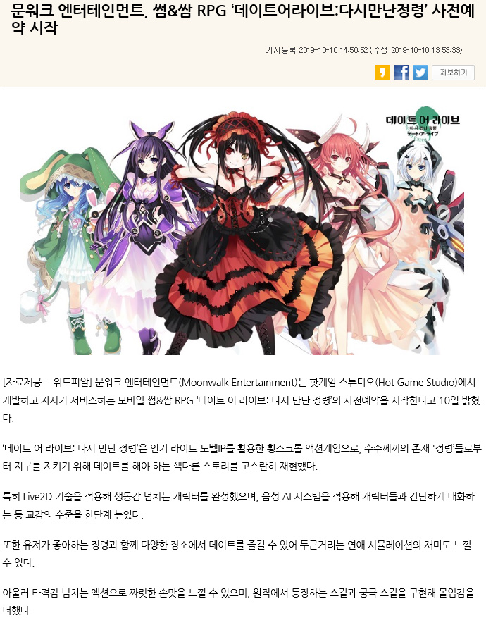 삘릴릴리 옛날에 애니로 보던 데이트어라이브가 모바일게임으로 나오네요ㅋㅋ 작성일시 : 2019. 10. 17 (10:49) 조회 : 3,034 / 댓글 : 0 요즘에 덕질 할만한 게임이 없어서 찾아보다가 발견했는데데이트어라이브가 사전예약을 받고 있더라구요ㅋㅋ옛날부터 재미있게 봤던 애니라 기대돼서 일단 예약 하고 왔네요.특히 저는 이츠카가 제일 마음에 들더라구요ㅜㅜ 이게 찾아보니까 음성 AI기능이 들어가서 캐릭터랑간단한 대화도 할 수 있다고 하더라구요ㅋㅋㅋ안그래도 캐릭터 다 모아서 키워볼 예정인데나중에는 대화만 하고 있지 않을까...ㅋㅋㅋ 2추천 글쓰기스크랩 신고