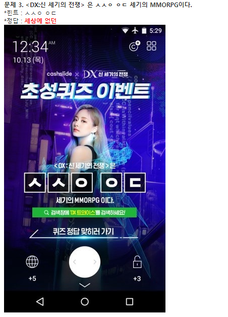 정소현 DX:신세기의전쟁 런칭!! 캐시슬라이드 정답은?! 작성일시 : 2019. 10. 31 (15:53) 조회 : 1,673 / 댓글 : 1 크으 DX:신세기의전쟁 런칭 했는데캐시슬라이드 퀴즈도 나왔으니꼭 정답 맞추시길바랍니다 ㅎㅎ 정답은 위에 적혀있어유 !! 진짜 DX 스토리도 스토리인데퀄리티가 너무좋아서 몰입감이 점점 높아집니다 ㅋㅋ 게임 진짜 잘만들었네여 이거 한마디로 정리가가능합니다 ㄷㄷ 2추천 글쓰기스크랩 신고