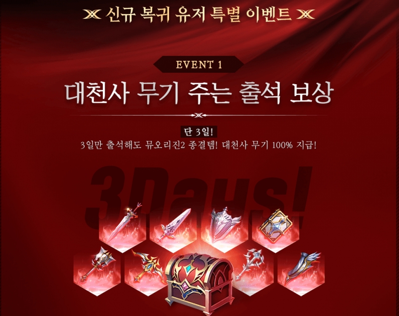 대천사의 무기를 그냥 3일만 출석해도 받을 수 있다고 하더라구요.