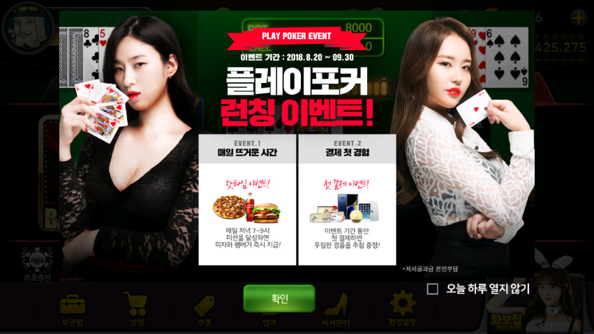 플레이포커가 런칭기념으로 퇴근길 저녘7시부터 9시까지 미션 달성하면 피자랑 햄버거 즉시 지급 하는데요.