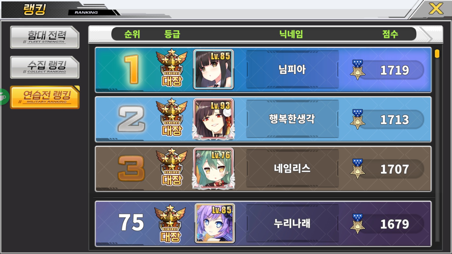 유희 벽람) 이건 처음!!! 작성일시 : 2018. 07. 12 (12:34) 조회 : 2,635 / 댓글 : 4 처음으로 연습전 대장이 되었네요...쭈욱 올라 가즈아~ㅎㅎㅎ 9추천 글쓰기스크랩 신고