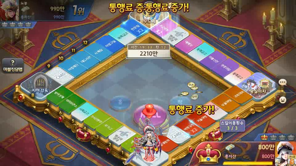 우미짱귀여웡 마블킹덤맵 플레이 해보셨나요? 작성일시 : 2020. 01. 23 (10:12) 조회 : 1,605 / 댓글 : 1 모두의마블이 업데이트 되면서 신규맵 마블킹덤이 추가되었습니다 왕관 4개를 모으면 승리하는 게임인데 보통은 그전에 많이 끝나더라구요 서로의 입찰 금액을 공개하지 않은채로 비공개 경매가 진행이되서 굉장히 심리적으로 설레이기도 하는데 돈 많으면 그냥 풀입찰로 즉시구입을 하면 되서 재화를 쌓는 것이 중요한 맵이었습니다 엄청 재밌게 플레이 했어요! 2추천 글쓰기스크랩 신고