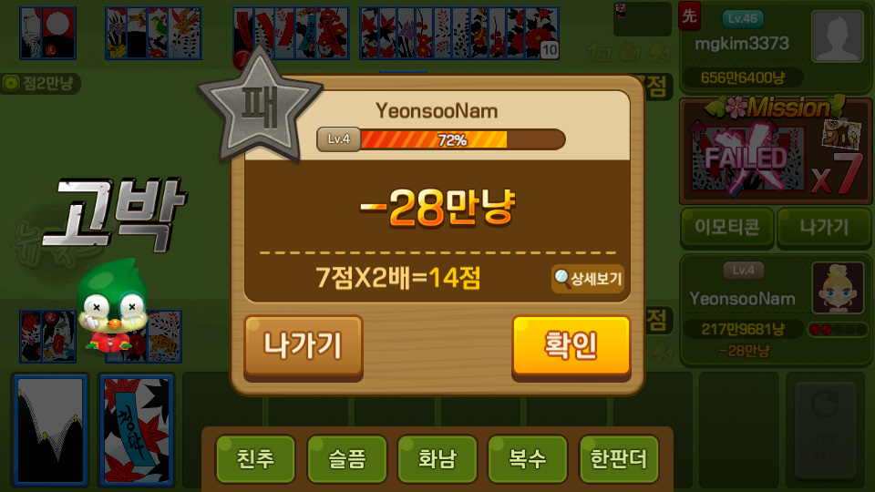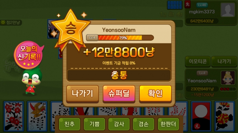 쵸풍신 맞고 재밌네 ㅋㅋ 작성일시 : 2020. 01. 23 (10:50) 조회 : 1,898 / 댓글 : 2 요즘 피망뉴맞고 다운 받아서 간간히 심심하 때 마다 하곤 하거든요와 근데 오늘은 욕심 내다가 고박으로 잃고,,그 다음판에서 총통으로 반 정도 따 왔습니다 ㅋㅋㅋㅋ총통이 나오냐 ㅋㅋ 요즘 이상하게 저는 패 받으면 똑같은 패가 겁나 많이 나와요..이상하게도..... 좋을때도 있지만 이거때문에 힘들때도 있는 ㅠㅠ아무튼 오늘은 쉽게 풀려서 그래도 다음판 부터는 ㅋㅋ 역시 맞고는 뒷패가 잘 붙어야.. 3추천 글쓰기스크랩 신고