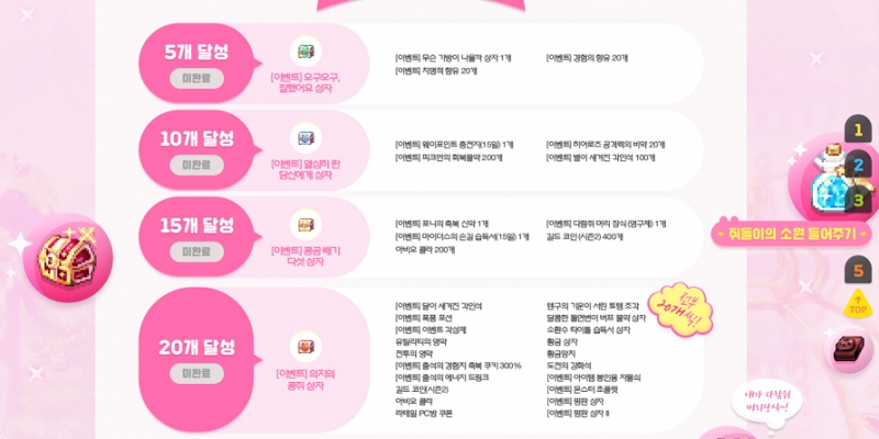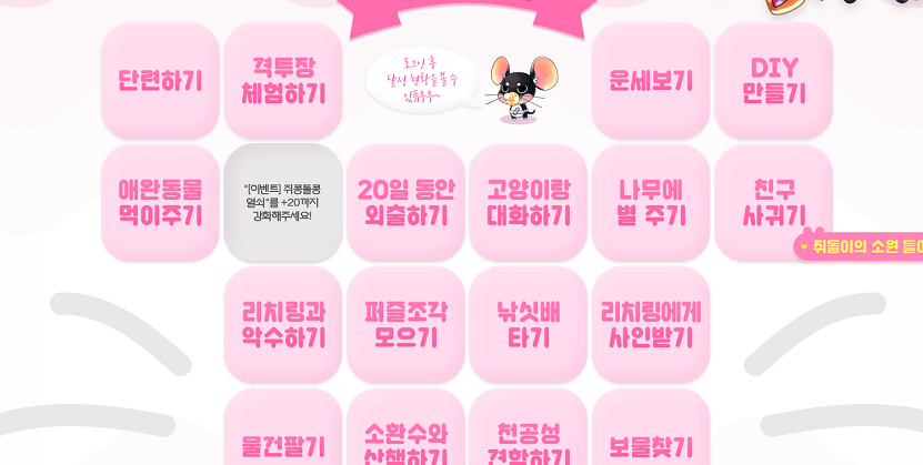 도붸르만 라테일 쥐돌이의 소원 들어줘야징 ㅋㅋ 작성일시 : 2020. 01. 30 (17:54) 조회 : 1,866 / 댓글 : 0 라테일이 2020해를 맞이해서 이벤트가 정말 많이 진행 중이죠특히 이번 콩공콩공 이벤트가 정말 많은데그 중에서도 쥐돌이의 소원들어주기 이벤트가 정말 좋습니다.복귀 신규 유저들이 라테일 적응하기에도 딱 좋죠 해당 소원 미션을 클리어하면 갯 수 만큼 보상을 주는데보상이 좋기도한데 엄청 많더라구요장식부터 강화석에 한정판 아이템들까지!후 저도 빨리 해야겠습니다 ㅋㅋ 2추천 글쓰기스크랩 신고