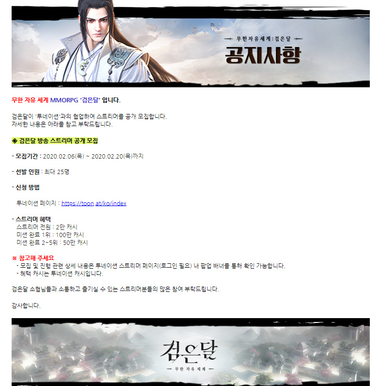 임푸름 검은달 스트리머 모집중!! 작성일시 : 2020. 02. 17 (15:32) 조회 : 1,819 / 댓글 : 0 검은달이 스트리머를 모집하고 있습니다 ㅎㅎㅎ 스트리머 혜택으로는 위와같은다양한 혜택이 존재하니 한번 도전해보시는 것도 좋을 것 같습니다 진짜 검은달 티저페이지만 보아도 완전 자유로운 게임 느낌이라방송하기에도 좋을 거라고 생각되네여 ㅋㅋㅋ 퀘스트마저 자신이 선택하는 방향대로라 상당히기대가됩니다ㅎㅎ 3추천 글쓰기스크랩 신고