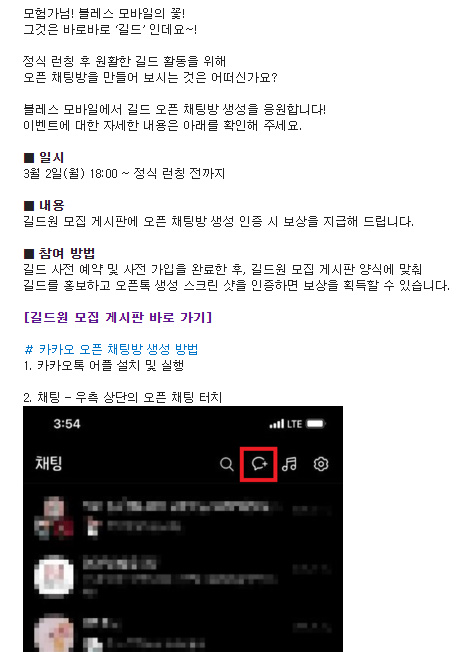 길드원 모집 게시판 양식에 맞춰서 홍보하고 오픈톡 생성 스크린샷 인증하면