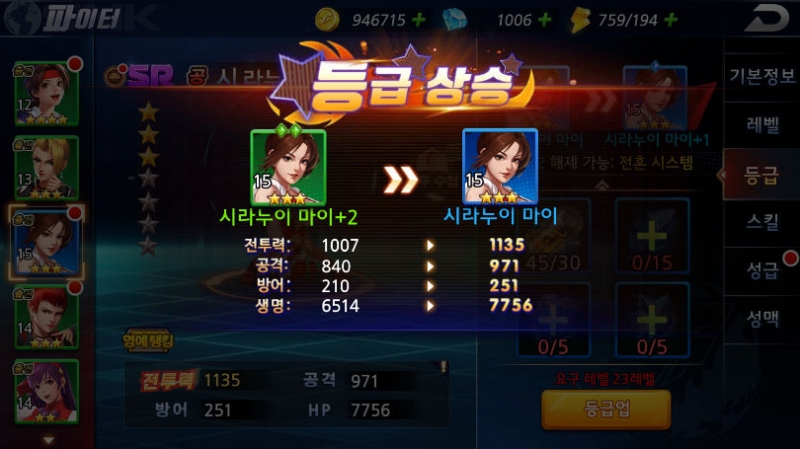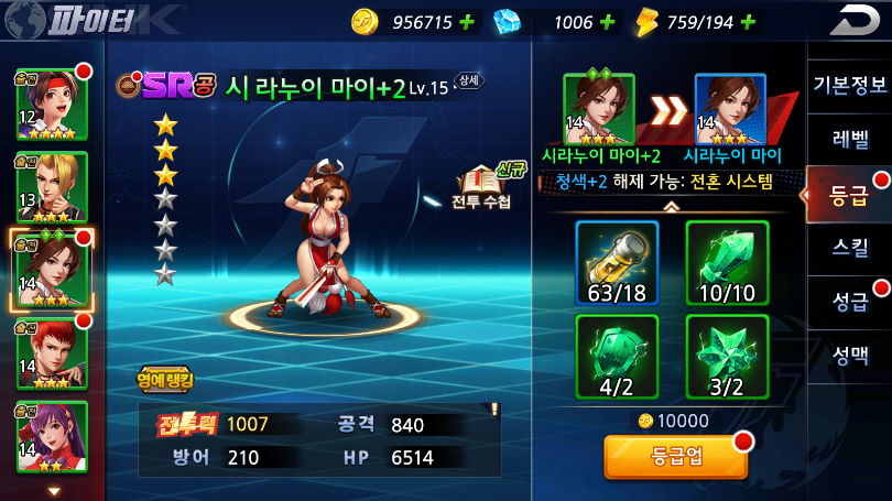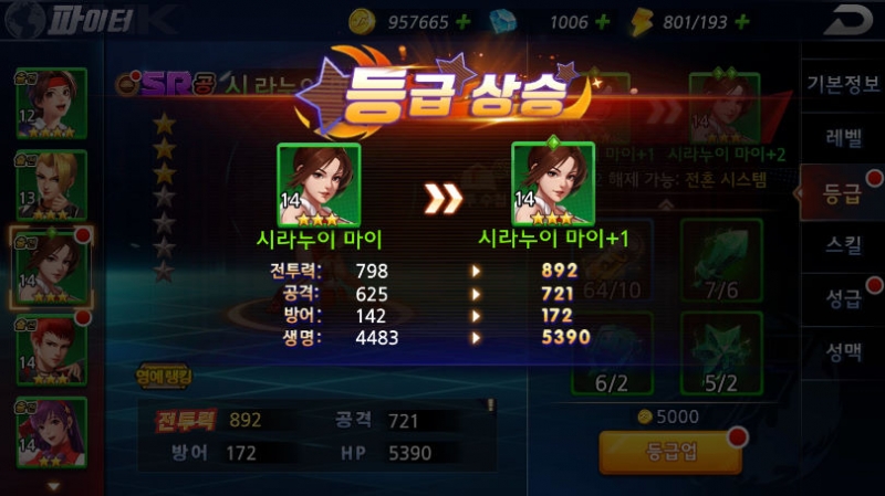 온나다나와 마이쨔응 첫 등급업! 작성일시 : 2020. 04. 17 (12:51) 조회 : 1,848 / 댓글 : 1 킹오파 익스트림매치 드디어 파랑색으로 첫 등급했습니다.최애캐는 역시 시라누이 마이이기 때문에 주력으로 올려줬죠.등급업을 하면 스킬이 개방되서 새로운 스킬도 배워서 슬슬 렙업 시켜주려고 합니다.이제 다음으로 유리 > 아테나 순으로 하나씩 등급업 시켜주려고 합니다.같이하는 친구녀석은 벌써 최애캐들 6개 파랑색으로 전부 등업했던데 주말에 열심히 달려봐야겠습니다. 2추천 글쓰기스크랩 신고