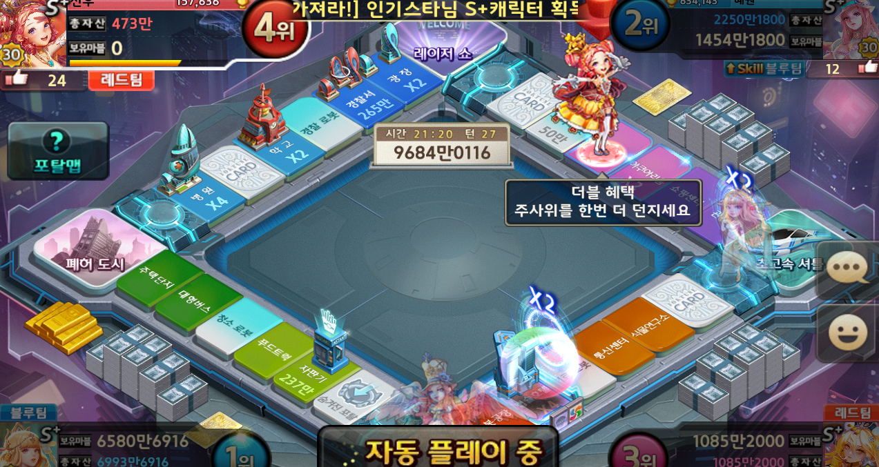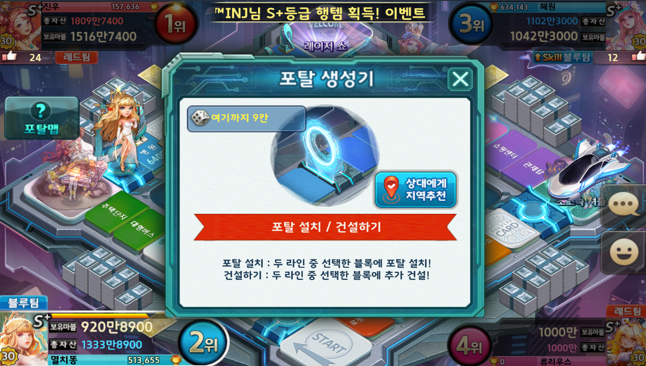 일단 포탈을 통해서 상대 땅으로 가면 통행료가 배가 됩니다..... 주사위를 던질 때 마다 더 올라가구요 ㅠ
