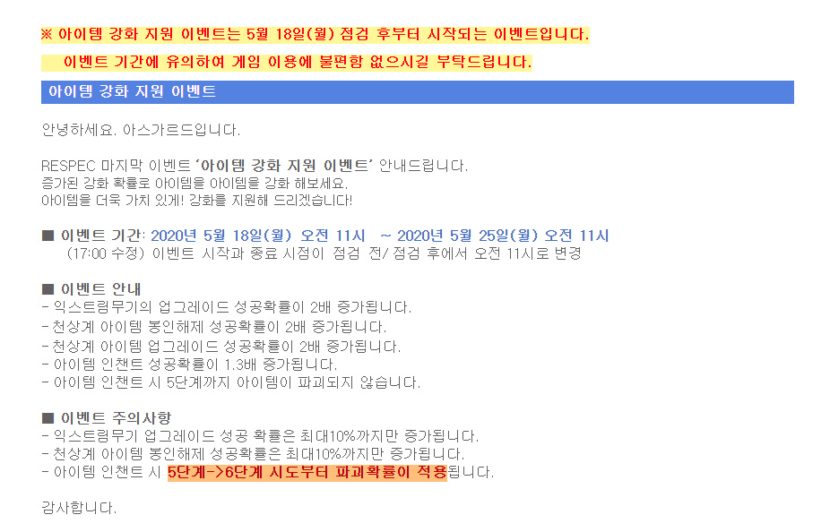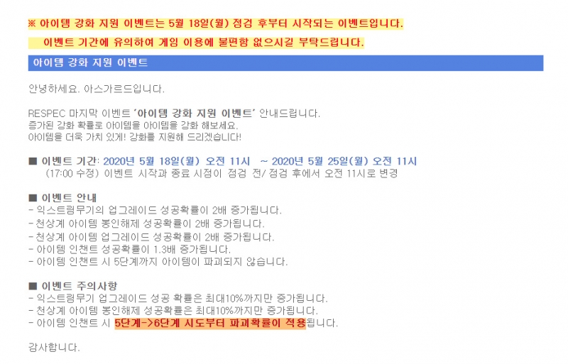 이번 강화 지원 장난 아닌 게 익스트림 무기에 이어서 천상계 템까지 업글 성공 확률 2배에