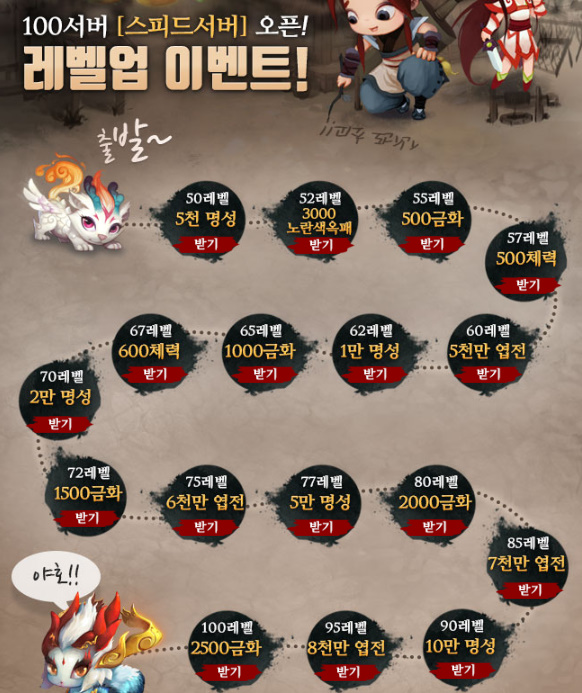 금화와 엽전 명성까지 육성에 필요한 3가지를 모두 주니 100레벨까지 모두 스피드하게 달리시죠!