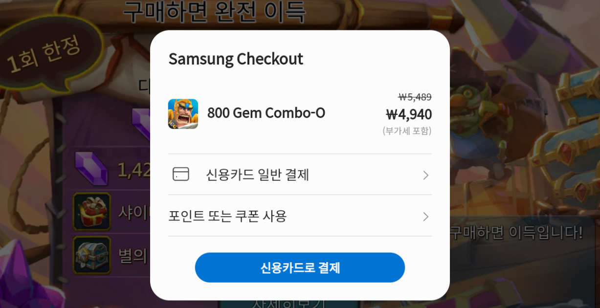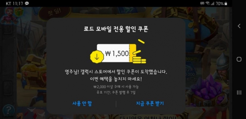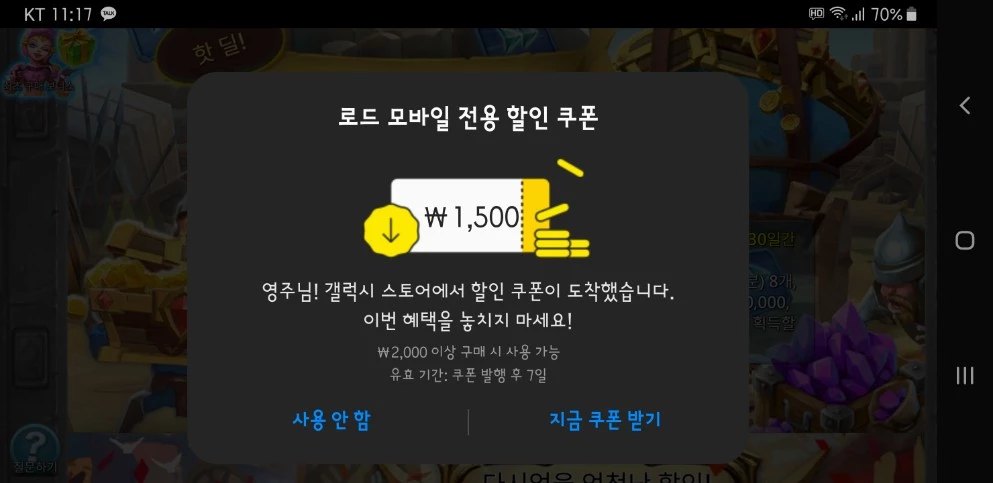 결제창 열기만 해도 로드모바일 전용 할인 쿠폰 준다고 그래서