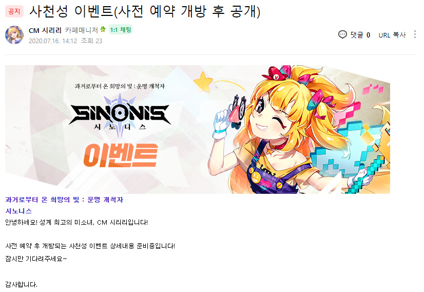 오늘 시노니스 티징 페이지 들어갔더니 바뀐게 없어서