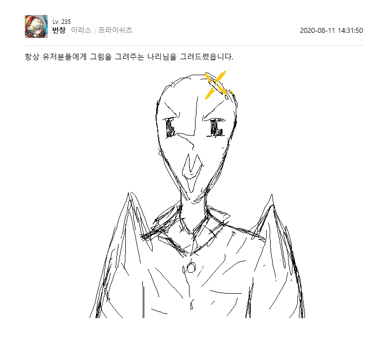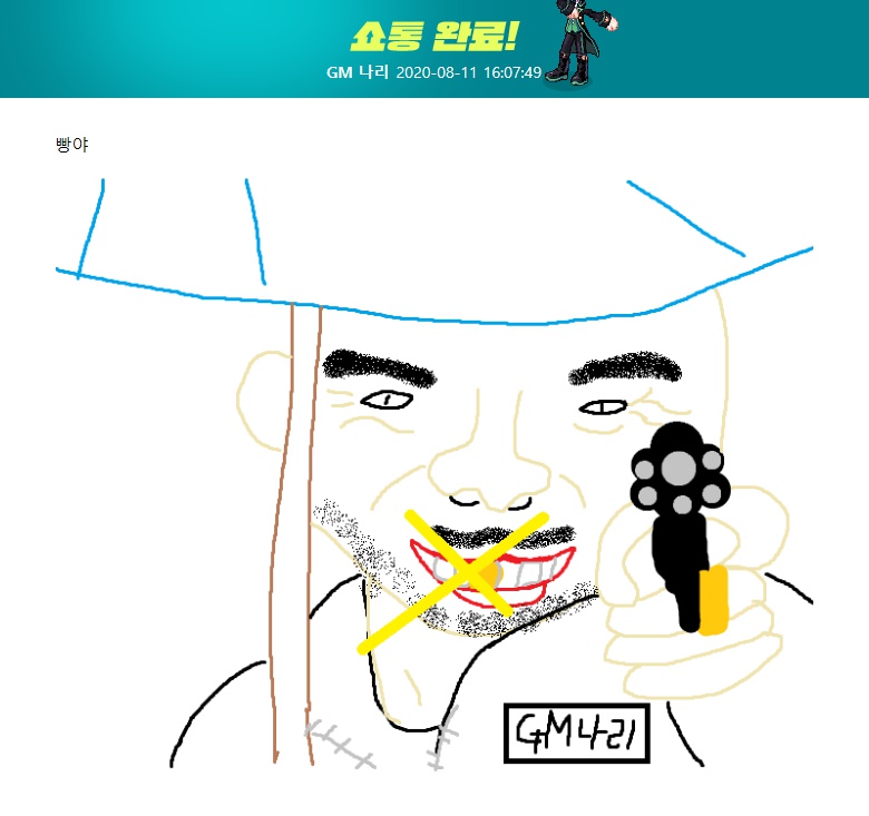 하쯔4 오늘자 라테일 GM의 쇼통 답변 작성일시 : 2020. 08. 11 (17:27) 조회 : 1,760 / 댓글 : 2 ㅋㅋㅋㅋㅋㅋㅋㅋㅋㅋㅋ라테일에서 쇼통 시즌3 하고있는데와 진짜 GM들 그림보면 특이하게 잘그리네요;;그림판으로 그리는거같은데 ㄷㄷ첨에는 그냥 웃겼는데 갈수록 그림 퀄리티가 좋아지심...역시 하다보면 늘어나는건가.. 1추천 글쓰기스크랩 신고