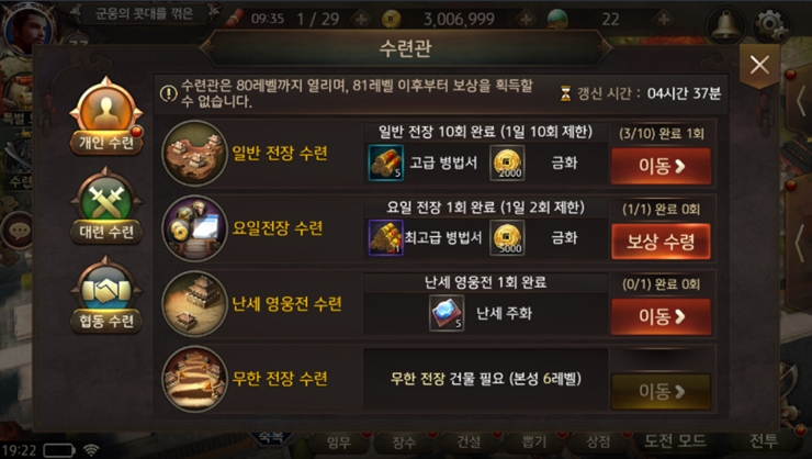 그리고 수련관에서 간단한 수련 미션을 통해 최고급 병법서와 금화, 난세 주화를 얻을 수 있죠.