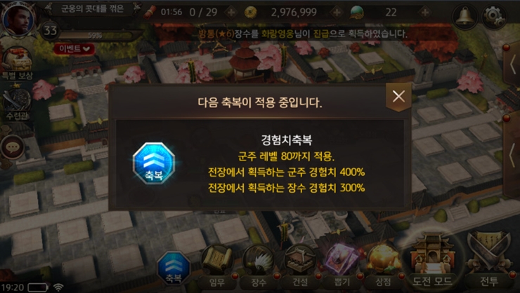 군주 레벨 80까지 경험치 축복을 받으니까 게임이 훨씬 쉽고 편하더라구요.