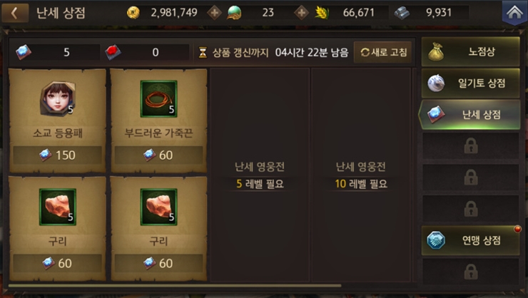 난세 주화는 전용 상점에서 일기토에서 추천하는 소교의 등용패, 가죽끈 등