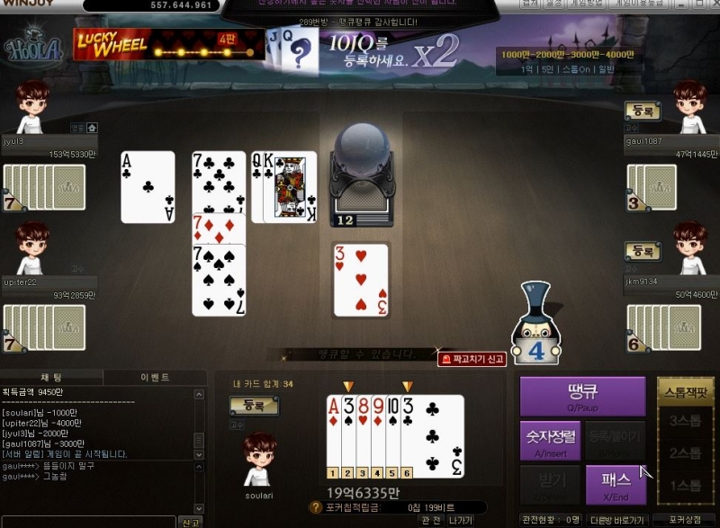만두만두 시간도 때울겸 하고 있는데... 작성일시 : 2020. 08. 18 (19:20) 조회 : 1,330 / 댓글 : 1 윈조이 홈페이지에서 시간도 떄울겸심심해서 PC 켠김에 윈조이포커 훌라를 해보고 있는데요. 그냥 멍~하니 시간때우기에 좋더라고요.물론 이렇게 땡큐 떴는데 멍때리고 있다가 놓칠수도 있지만 ㅋㅋ 예전에는 몇번 놓치진 했는데이제는 떙큐 뜨면 바로 칼같이 눌러요 ㅋㅋ 1추천 글쓰기스크랩 신고