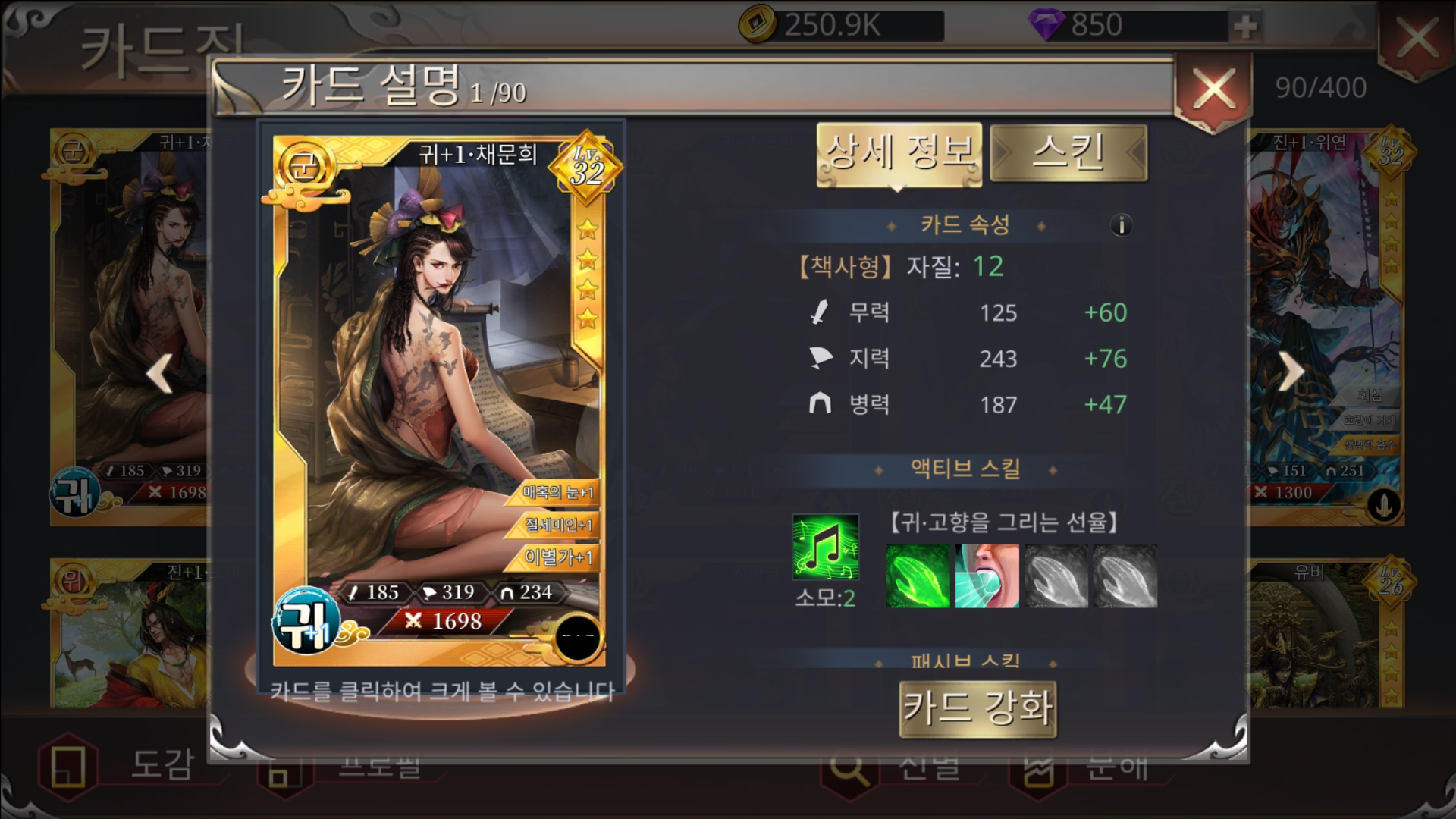 스핏60 진삼국대전2 앞으론 채문희를 밀어줄려고요. 작성일시 : 2020. 08. 19 (17:54) 조회 : 1,760 / 댓글 : 0 진삼국대전2 시작하면서 채문희를 얻었는데대미지가 약해도 몇 없는 힐러인데다키우기 쉬운 무장이라서 자주 쓰게 되네요.그리고 일러스트에서 뒷라인이 참 예뻐서그거 보는 맛으로 쓰기도 하지만요 ㅋㅋㅋ 그러면서 5성 무장이 될 수 있는 몇 없는 무장이 되었으니그 가치는 더욱 상승하게 되네요.5성이 되면 치명적인 스타일의 옷을 입고미소 짓는 걸 보니까 가슴이 아프네요.... 1추천 글쓰기스크랩 신고