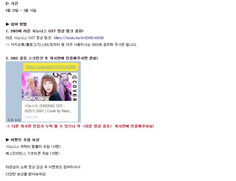 우미짱귀여웡 라온 커버 곡 넘 좋다.. 작성일시 : 2020. 09. 04 (15:20) 조회 : 1,074 / 댓글 : 1 라온 커버곡 들어봤습니다시노니스 사전예약하면 볼 수 있는 오프닝곡을라온님이 커버해서 올렸더라구요역시 400만 유튜버라서 그런지 한국분인줄 알고 있는데일본어도 굉장히 잘하시네요 ㄷㄷ커버곡 듣는 내내 귀가 힐링했습니다 겸사겸사 공식카페에 이벤트 하고 있길래이벤트도 참여하면서 기다리고 있는데얼른 시노니스 출시됬으면 좋겠네요 ㅎㅎ 3추천 글쓰기스크랩 신고
